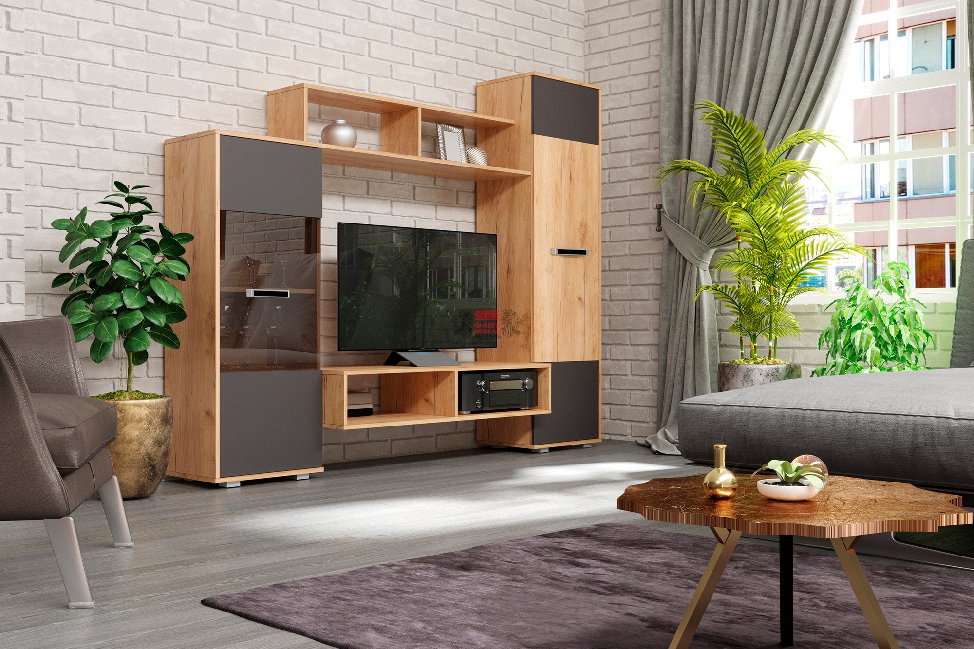 Стильный вариант гостиной Александра - 5 будет прекрасно смотреться в любом интерьере. Гостиная наполнена закрытыми нишами и открытыми полками, а также несколькими зонами со стеклянными дверцами, что облегчает конструкцию. На верхней открытой полке вы сможете разместить свои любимые сувениры или фотографии. Для моделей телевизоров с диагональю до 43"