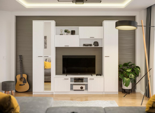 Стенка Бертелена шикарное решение для гостиной. Хороший функционал, широкая ниша для ТВ, зеркальный декор на фасаде будет отличным дополнением для вашего интерьера. Гостиная Бертелена выполнена в цвете Белое дерево.