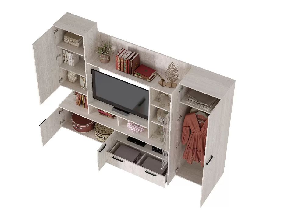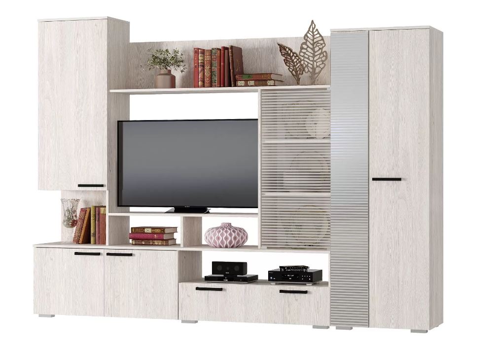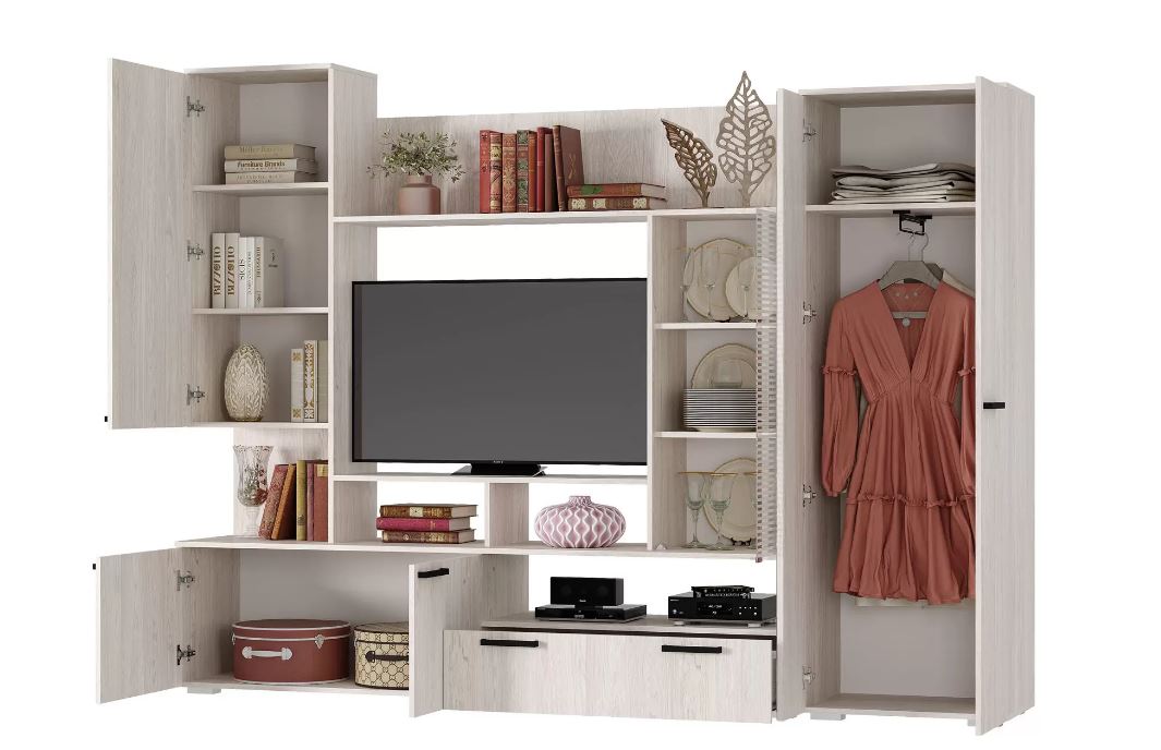 Стенка Денди стильная, бюджетная модель. Прекрасно впишется в современный интерьер. Наполнение гостиной Денди очень функциональное.