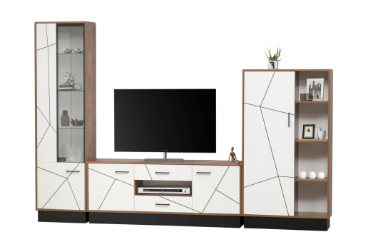 Стенка Гамма станет достойным украшением вашей гостиной. Стильный дизайн придаст интерьеру особый шарм. Ручки выполнены из пластика. Фасад комбинированный МДФ в пленке ПВХ с фрезеровкой УФ-печатью.