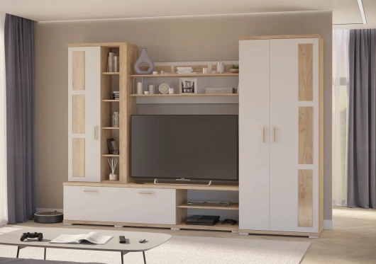 Стенка Канди 6-575 придаст шарм вашей гостиной. Она разместит современный большой телевизор, за закрытыми дверьми, вы сможете разместить вещи. Благодаря функциональности гостиной Канди 6-575 в вашей гостиной будет красота и порядок. -