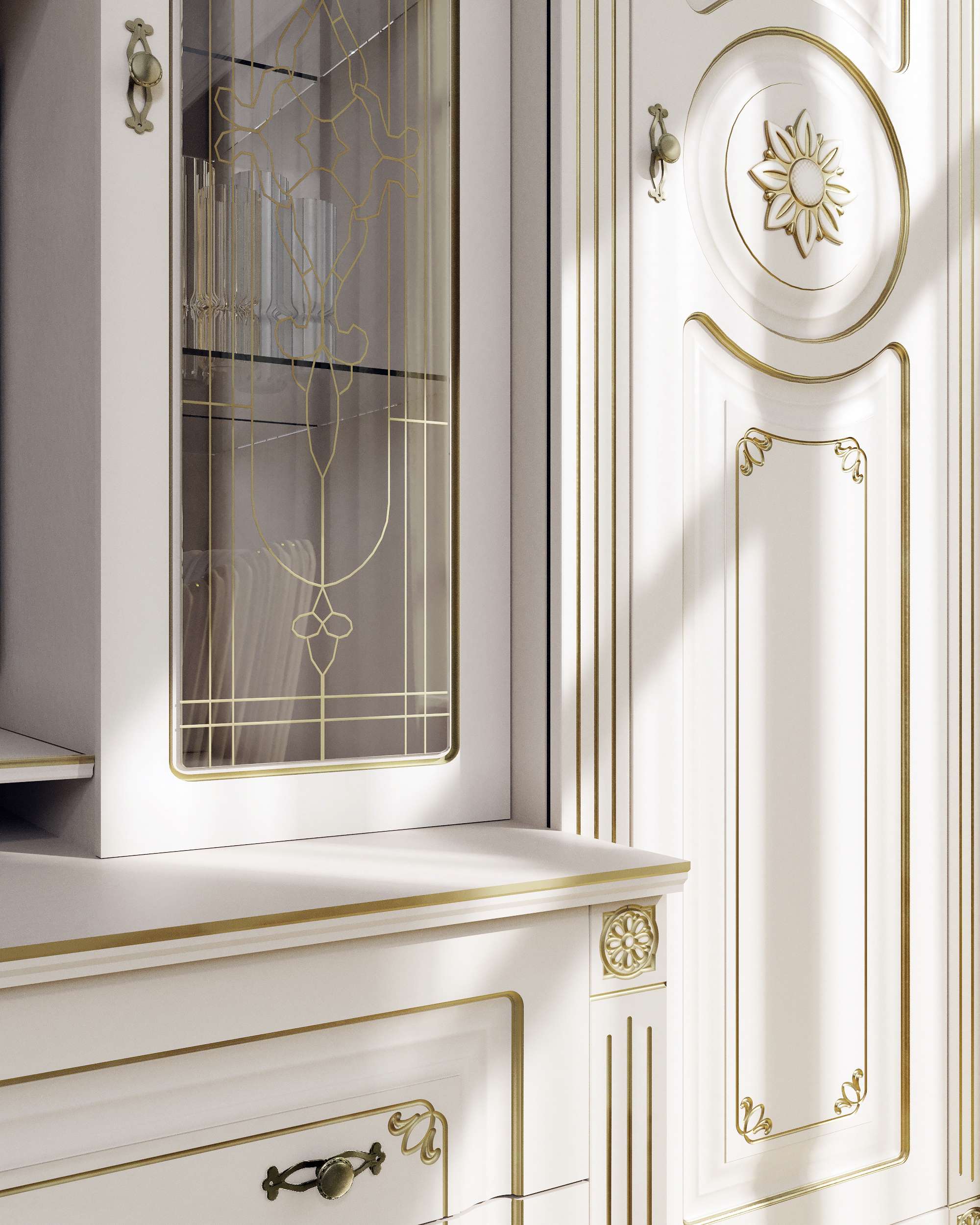 Стенка «Магнолия» - яркий образец классического стиля с элементами барокко. Украшенная витиеватыми узорами и резными ручками, она выглядит изысканно и очень необычно. Стенка состоит из двух шкафов-пеналов, секции под телевизор с витражными стеллажами по бокам, вместительными ящиками снизу, а также открытой верхней полкой. В данной модели гармонично сочетаются основные элементы классики: лепнина, высокие карнизы, кованые ручки, небольшие бортики и рамки на фасаде. Помимо привлекательного дизайна, стенка несет функциональный характер. В шкафах Вы сможете расположить как деликатную, так и верхнюю одежду – для этого в двустворчатом шкафу предусмотрена штанга. Стеллажи со стеклянными дверками, украшенными витражами, идеально подойдут для хранения посуды и предметов декора. В широких нижних ящиках Вы сможете расположить книги, личные вещи и другую домашнюю утварь. Верхняя открытая полка с позолоченным карнизом послужит отличным местом для Ваших вещей, на которых хочется сделать акцент: памятных фото, любимых сувенирах, цветочных композициях. -