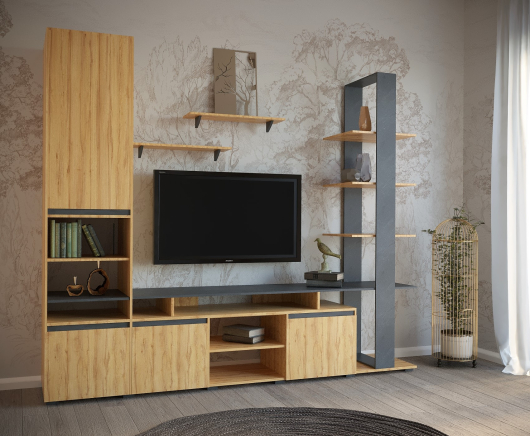 Стенка Скай лёгкая и воздушная модель. Она сделает гостиную функциональной. Сочетание древесных тонов с цветом антрацит делает стенку Скай стильной и модной. -