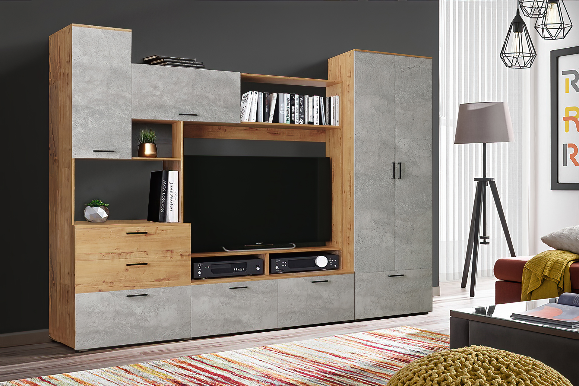 Стенка Тиффани стильное решение для современной гостиной. Приятное сочетание серых фасадов и тёплых, древесных тонов позволит обустроить гостиную в стиле лофт.