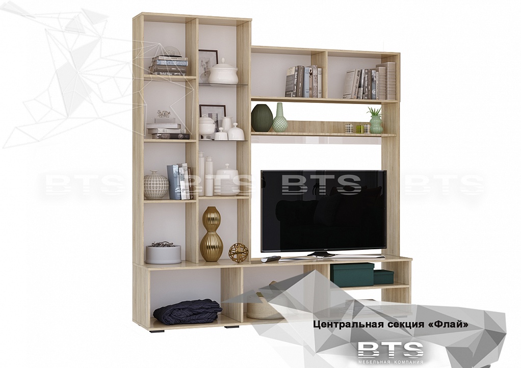 Центральная секция Флай ЦС-01 обеспечит комфорт и уют в вашей комнате. Специальная подставка позволит разместить телевизор на правильной высоте для более удобного просмотра любимых сериалов и познавательных телепередач. Открытые ниши пригодятся для необходимой аппаратуры: DVD-плеера, ТВ-тюнера или игровой приставки. Вместительные ящики и отделения с глухой дверцью можно использовать как для хранения одежды, так и для посуды и книг. На открытых полках будут отлично смотреться семейные книги, элегантные статуэтки, ваза с красивыми цветами и оригинальные предметы декора.