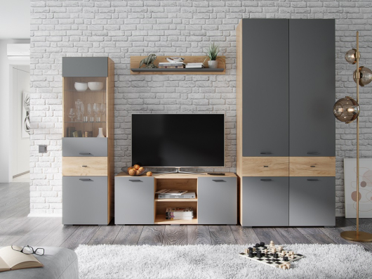 - пенал Дублин - Ш450 х Г376 х В1664 мм.Гостиная Дублин (вариант 2) поможет со вкусом обустроить уютную и комфортную комнату. На навесной полке и полках, скрытых за дверцей со стеклом, будут гармонично смотреться семейные фотографии, интересные книги и оригинальные предметы декора. За глухими дверьми и в выдвижных ящиках найдется место для хранения посуды, семейных фотоальбомов, а также одежды и других вещей. Тумба ТВ поможет разместить телевизор для более комфортного просмотра новостей, сериалов и различных телепередач. Открытая ниша предназначена для необходимой аппаратуры. За двумя распашными дверьми шкафа находится широкая штанга для вешалок-плечиков с верхней одеждой, платьями и деловыми костюмами.