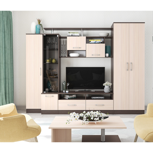 Гостиная Оскар-5 обладает отличной функциональностью и комфортом при ежедневной эксплуатации. Эти необходимые свойства обеспечивает наличие нескольких вместительных секций, позволяющих с удобством разместить все нужные вещи. Специальная подставка создана для размещения телевизора для комфортного просмотра, открытые ниши пригодятся для необходимой аппаратуры. За двумя распашными дверьми находится штанга для вешалок-плечиков с одеждой. На полках скрытых за стеклянной дверцей будут гармонично смотреться наборы посуды, интересные книги и прочие оригинальные предметы. Продуманное цветовое решение мебели гарантирует ее совместимость с практически любым современным интерьером.