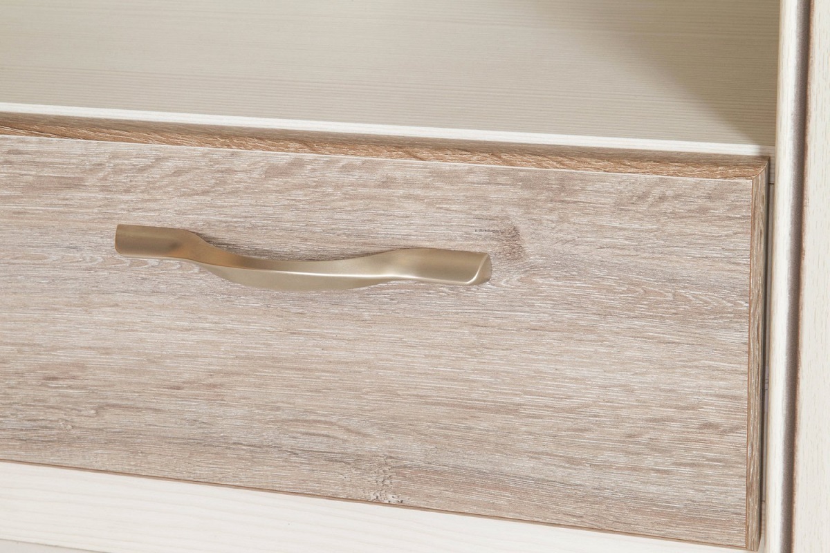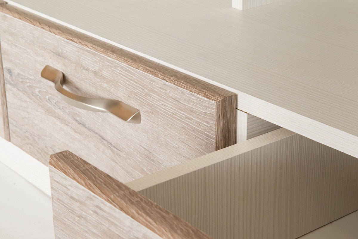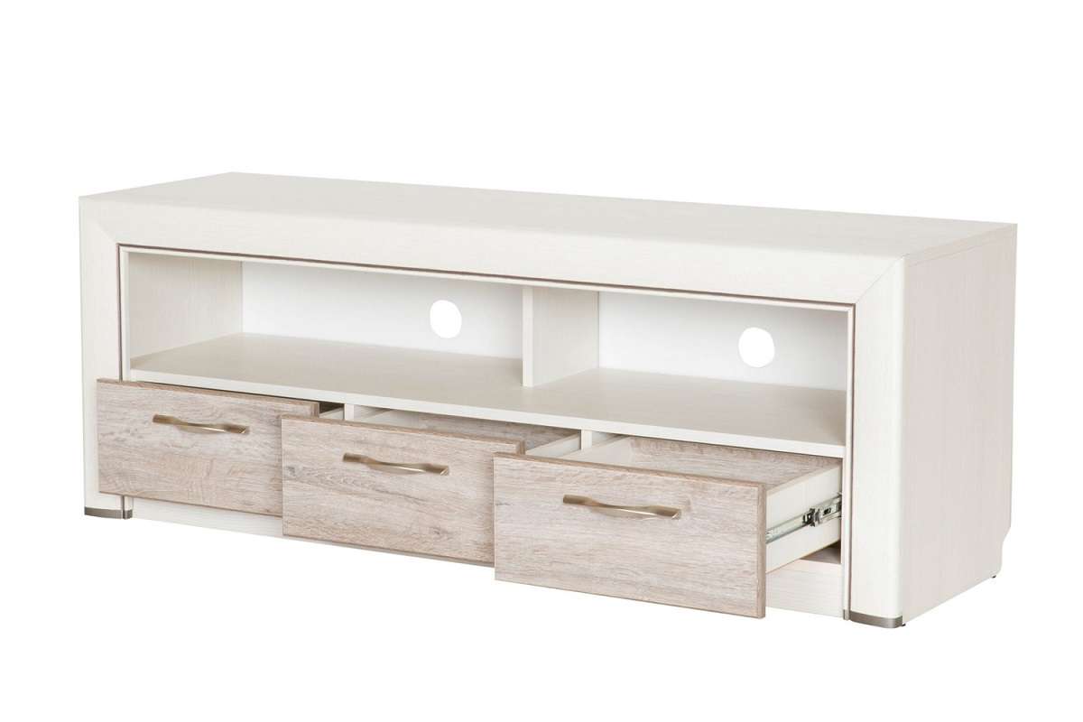 Тумба под телевизор Оливия представляет собой элегантное сочетание освежающей современности и актуальной во все времена классики. Светлые оттенки и лаконичные формы эффектно дополнены фасадами с декором, имитирующим фактуру натуральной древесины. Конструкция отличается не только оригинальностью но и функциональностью. Две открытых полки предназначены для установки видеотехники и оборудованы отверстиями под провода. Три выдвижных ящичка с удобными ручками подходят для хранения видеодисков, журналов и прочих вещей. -