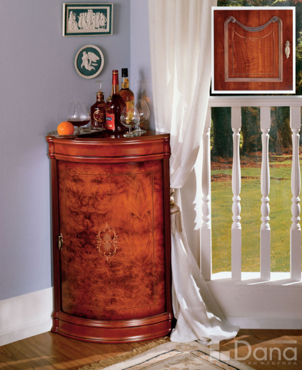 Угловая тумба . Испанский классический стиль. Материалы - МДФ, ДСП. Многослойная лакировка с умеренным глянцем. Текстура - срез орехового дерева. Удобна в использовании в качестве мини бара, с пользой заполнит пустое пространства углов комнаты.
