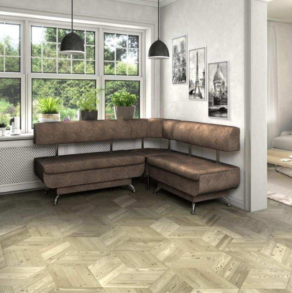 Современный кухонный набор станет любимым местом для сбора семьи на кухне. Под сидением уголка есть ящики для хранения. Столешница стола выполнена из ЛДСП 16 мм + стекло с фотопечатью 4 мм. -