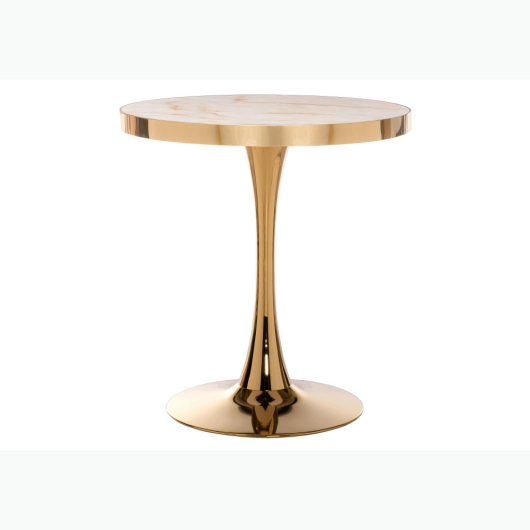 Стол Dorian предназначен для размещения в зоне отдыха в гостиной или на кухне. Подстолье выполнено из каркаса и одной металлической ноги в золотом цвете хорошо поддерживает круглую акриловую столешницу. Поверхность столешницы, имитирующая мрамор, гармонично сочетается с золотистым каркасом. Стол органично впишется в интерьер, выдержанный в современном стиле. Небольшой столик можно использовать для чая или кофе. -