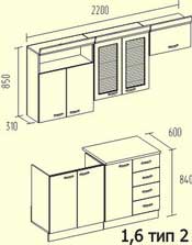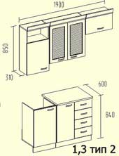 Высота столов: 840 мм, высота навесных шкафов: 850 мм, глубина навесных шкафов: 310 мм
