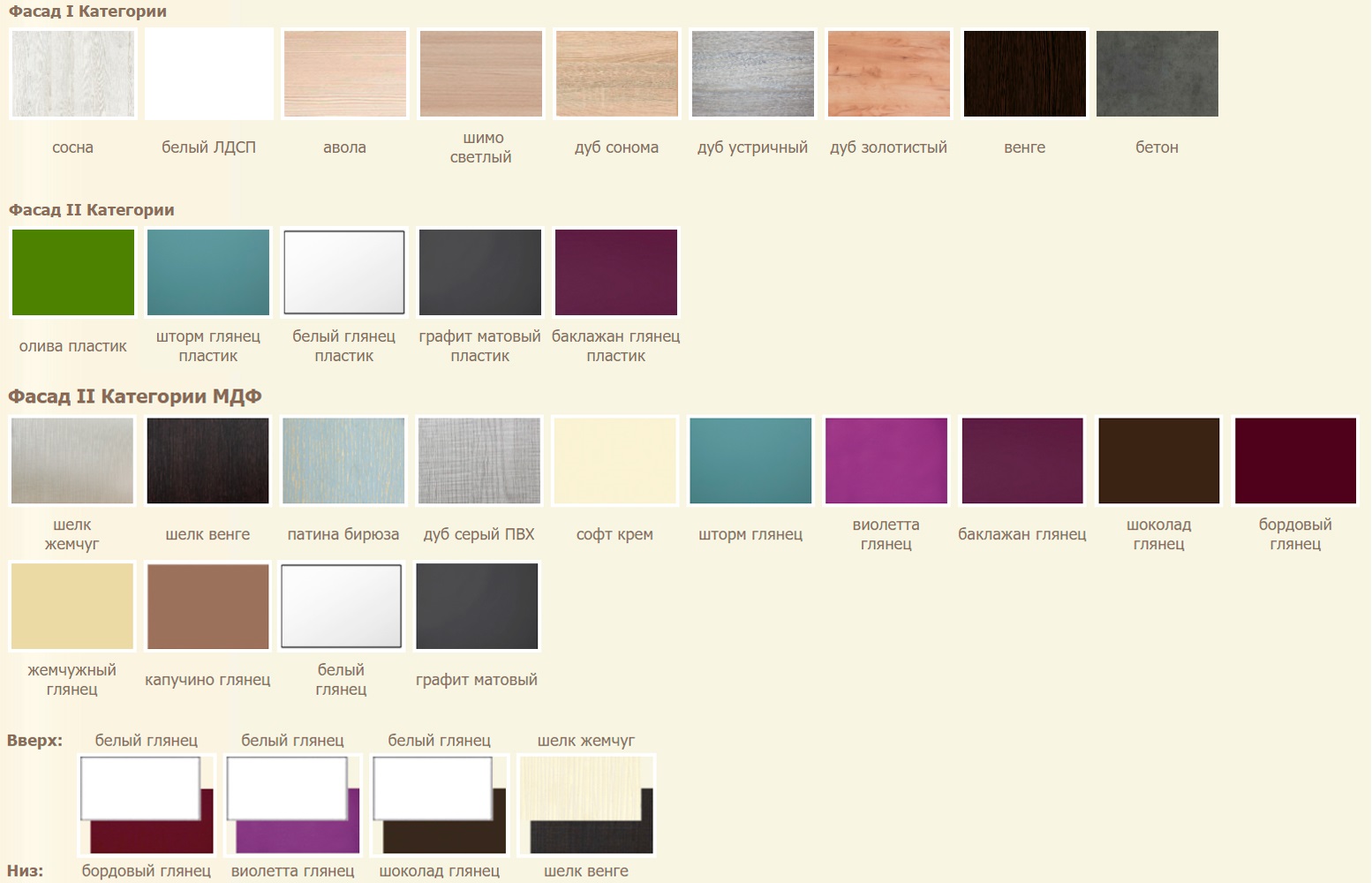 - Фасады 1 категории цвет рамок-витрин металлик у всех кроме вишни, клен глянец.