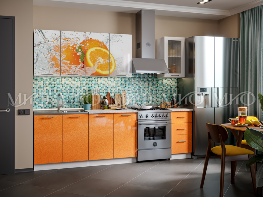 Кухня Апельсин стильная и современная модель. Сочетание оранжевого цвета с яркими, сочными фасадами с апельсинами внесёт яркий штрих в интерьер вашей кухни. -