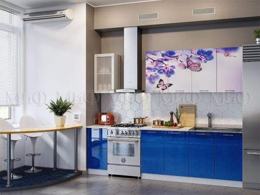 Кухня Бабочки стильная и современная модель. Сочетание синего цвета с яркими бабочками внесёт яркий штрих в интерьер вашей кухни. Синий цвет успокаивает и навевает воспоминания о море и положительных эмоциях. -