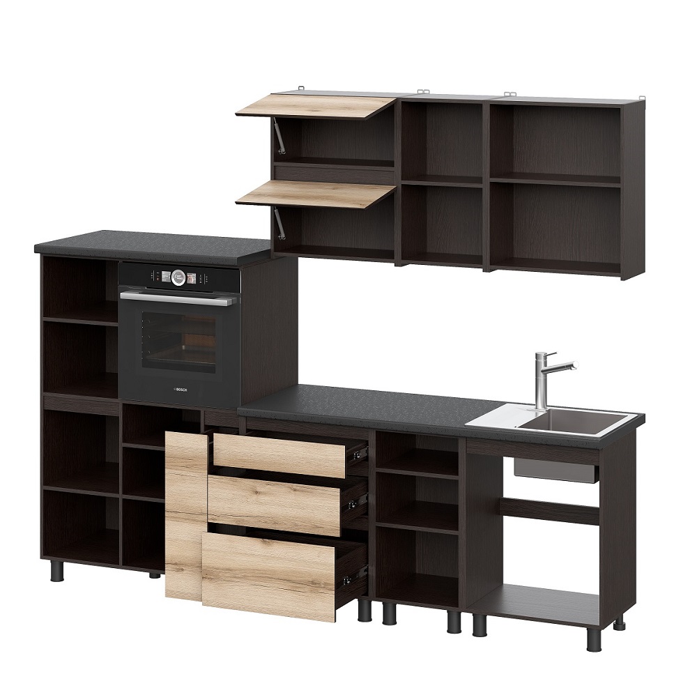 В кухонный комплект входит темная столешница, изготовленная из ДСП и покрытая слоистым пластиком. Кромка из первичного АБС пластика 0,4 мм по боковым и задним торцам предотвращает возможность разбухания и появления плесени в агрессивной влажной среде. Столешница выдерживает большую нагрузку, устойчива к ударам, воздействию бытовой химии и влаги, сохраняет цвет даже при интенсивной эксплуатации.