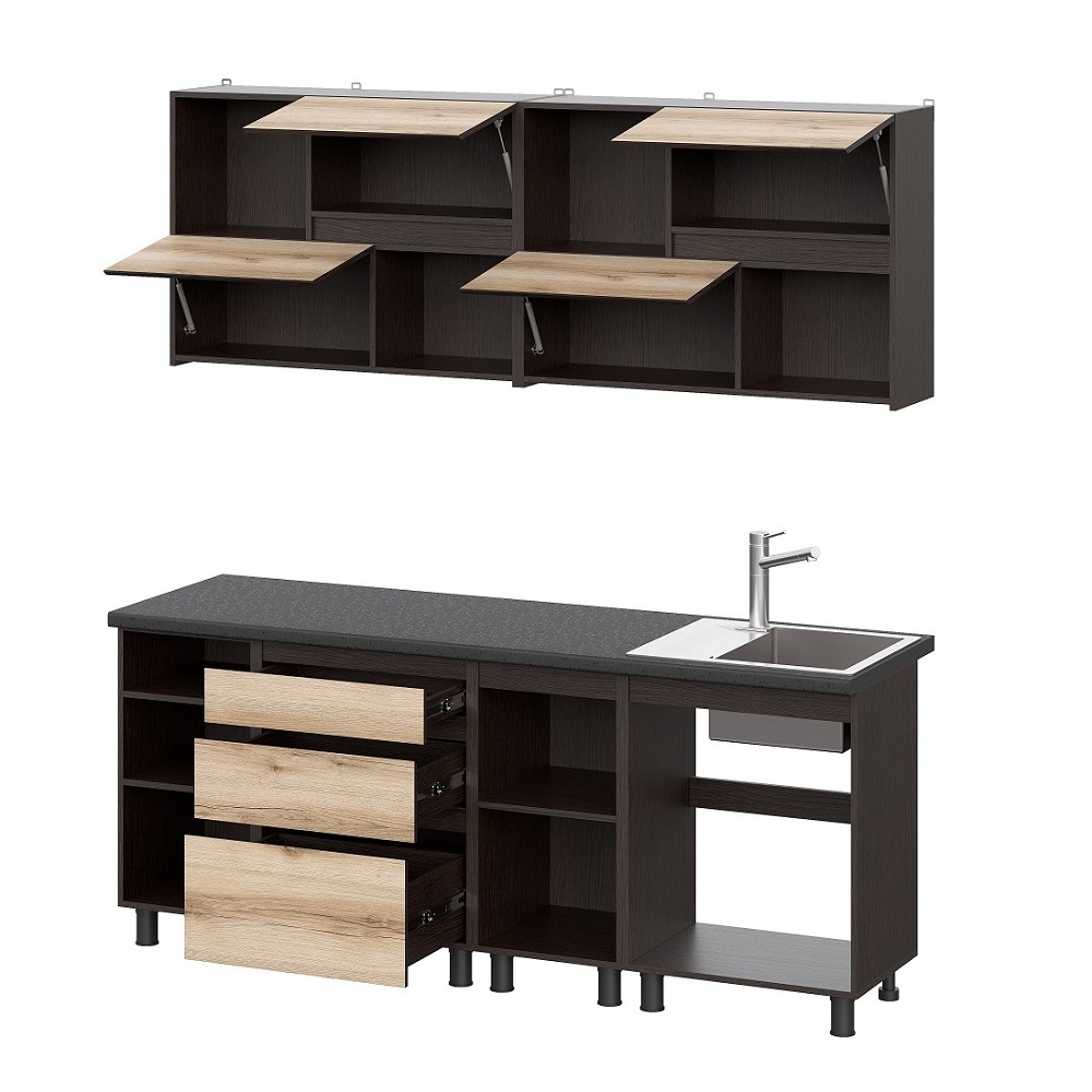 В кухонный комплект входит темная столешница, изготовленная из ДСП и покрытая слоистым пластиком. Кромка из первичного АБС пластика 0,4 мм по боковым и задним торцам предотвращает возможность разбухания и появления плесени в агрессивной влажной среде. Столешница выдерживает большую нагрузку, устойчива к ударам, воздействию бытовой химии и влаги, сохраняет цвет даже при интенсивной эксплуатации.