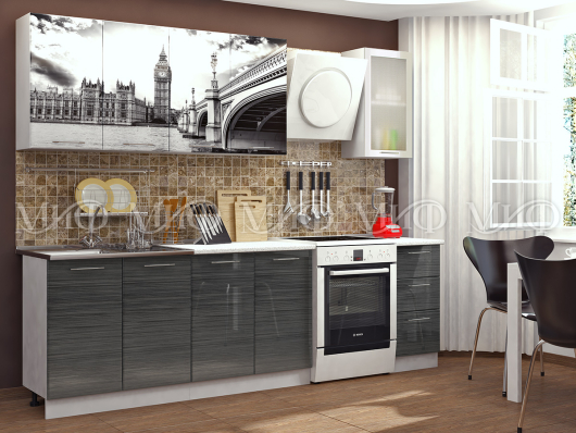 Кухня Биг-Бен стильная и современная модель. Сочетание тёмного цвета с бело-серыми тонами фасадов с видами на Биг-Бен, внесёт яркий штрих в интерьер вашей кухни. Наслаждаться чашечкой чая с английскими мотивами будет приятно в тёплом, семейном кругу. -