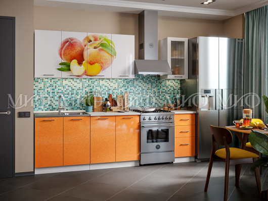 Кухня Персик стильная и современная модель. Сочетание оранжевого цвета с яркими фасадами с сочными персиками внесёт яркий штрих в интерьер вашей кухни. Ароматные персики будут долгим напоминанием о лете, отпуске и море. -