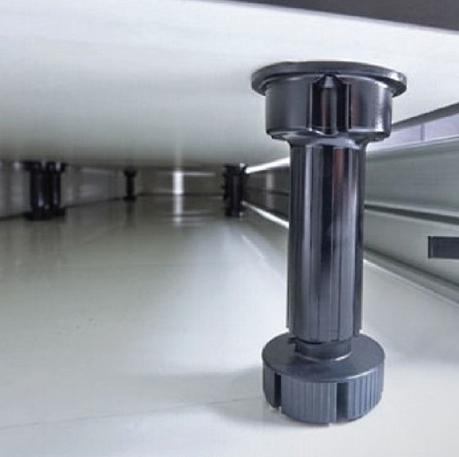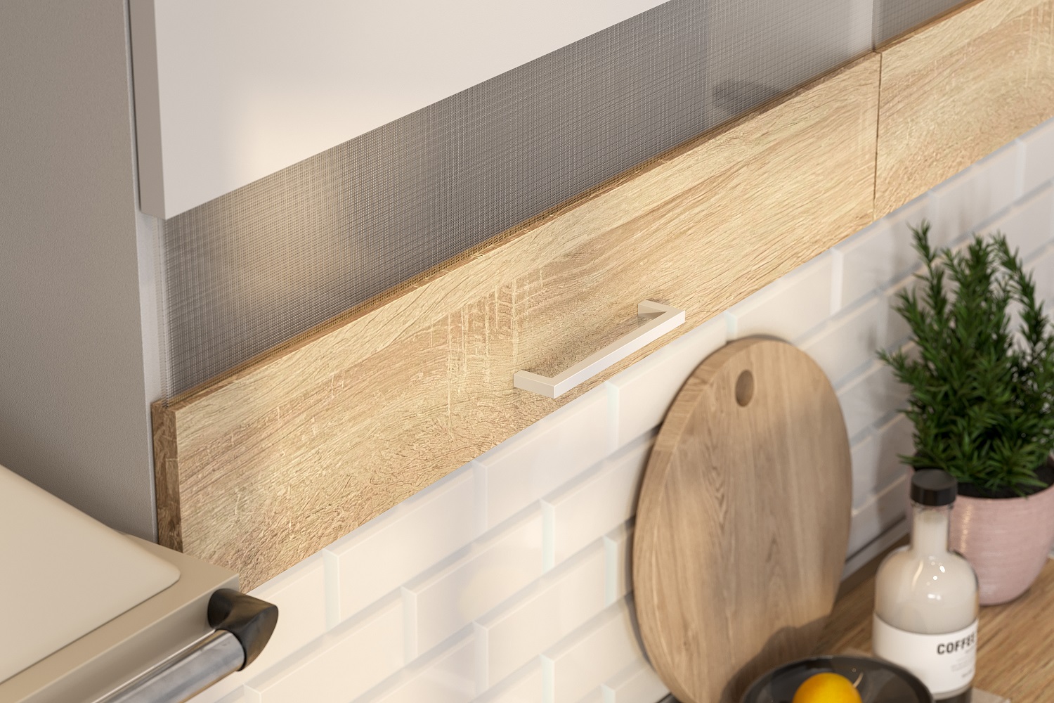 Каждый нижний модуль кухни укомплектован двумя декоративными передними и задними опорами, регулируемыми по высоте и сглаживающими неровности пола. Все створки оснащены четырех-шарнирными петлями. Современные белые ручки геометрической формы выполнены из АБС пластика и гармонично дополняют композицию.