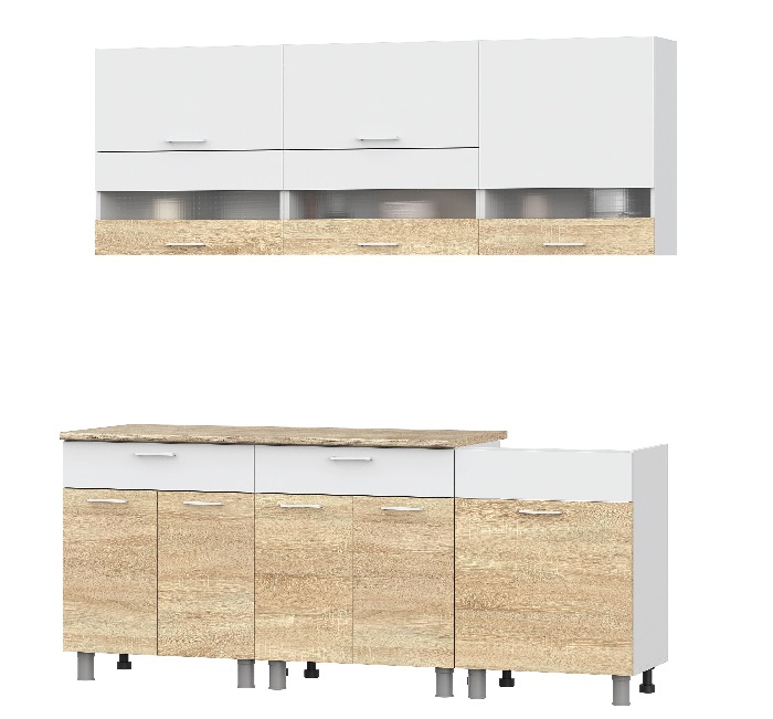 Кухня Ультра 2 м - современное решение для кухни в скандинавском стиле. Натуральный декор, без лишнего пафоса, сделает кухню натуральной и гармоничной. Стол под мойку рассчитан для мойки 60 см. Верхние модули со створками на газлифтах позволяют организовать грамотное хранение продуктов, кухонных принадлежностей и посуды. Модель выполнена из надежных экологически-чистых материалов природного происхождения. В производстве используется ЛДСП европейского качества, которая не подвержена сколам, легко переносит повторные сборки и служит не один год даже при интенсивной эксплуатации.