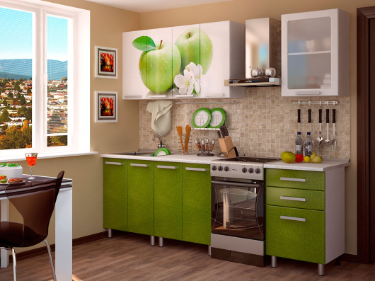Кухня выполнена в современном стиле и подходит для любого интерьера. Фасад верхних двух шкафов обклеен фотопечатью и один шкаф со стеклом. Два верхних и два нижних шкафчика имеют по две распашные двери, один верхний - одну распашную дверь и один нижний - три выдвижных ящика.