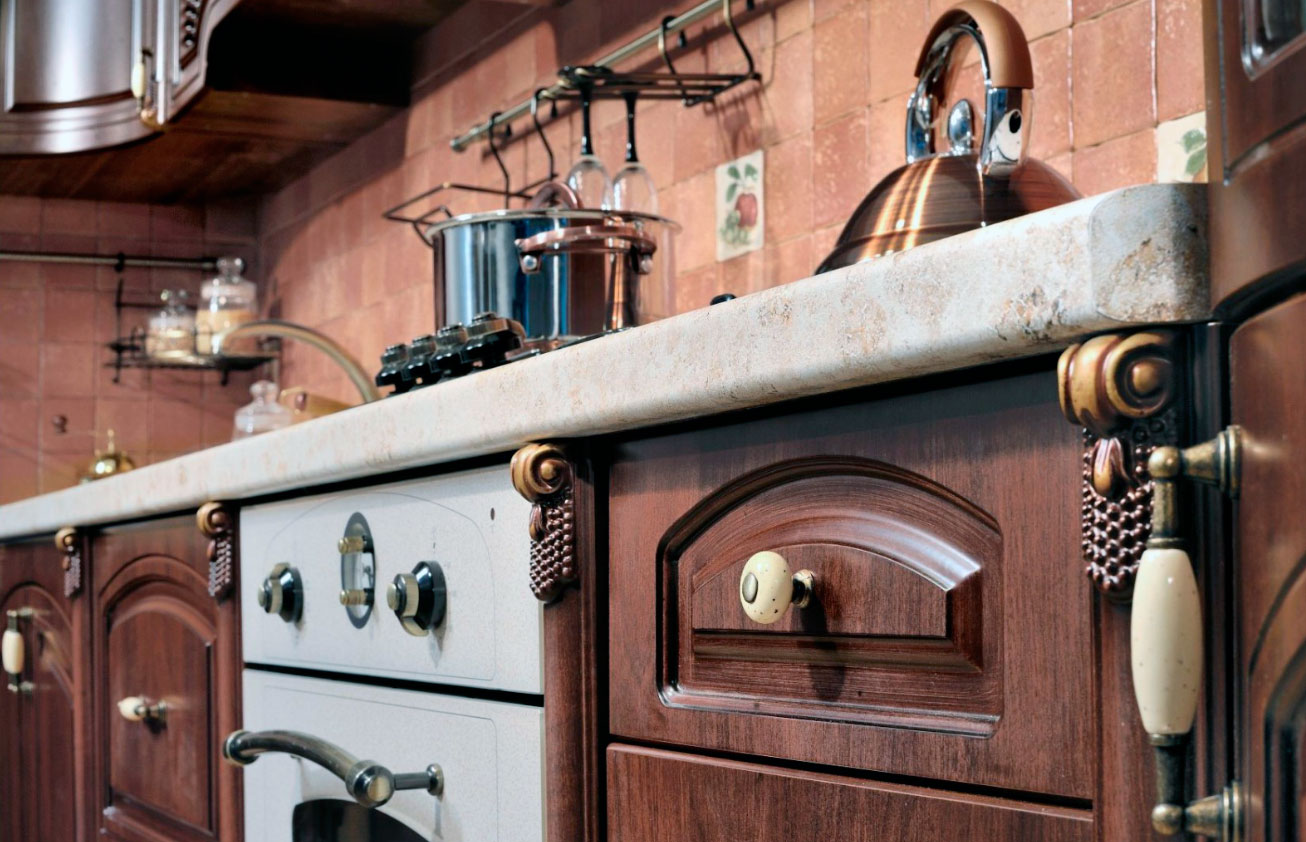 Декоративные элементы, фасады, накладки покрыты темной патиной и матовым лаком