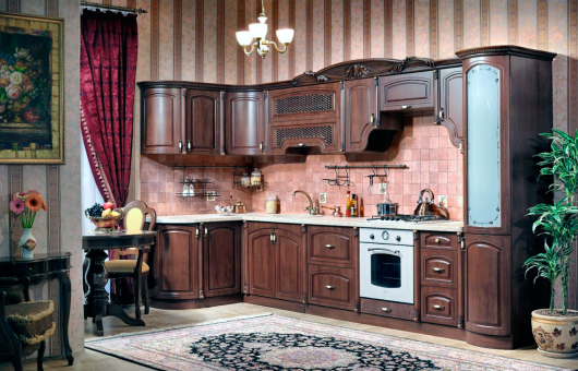 Кухня Мадлен угловая Караваджо сочетает в себе классический стиль и высочайшее качество. Резной карниз, круглые фасады делают модель очень шикарной. Очень много шкафов и столов добавляет кухни функциональности.