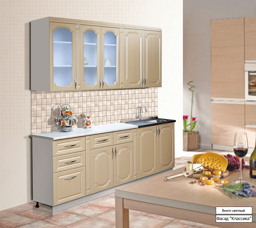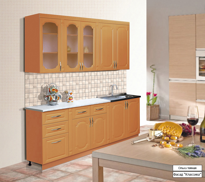 Кухня сделана в классическом стиле. Высота верхних шкафчиков - 918 мм. Столешница нижних шкафов сделана из влагостойкого материала. Фасады с фрезеровкой придают особую изюминку этому кухонному гарнитуру.