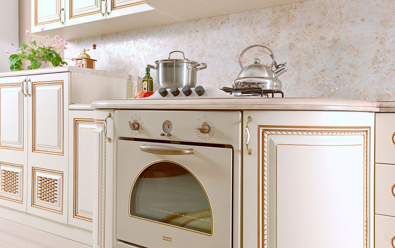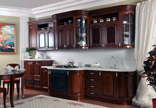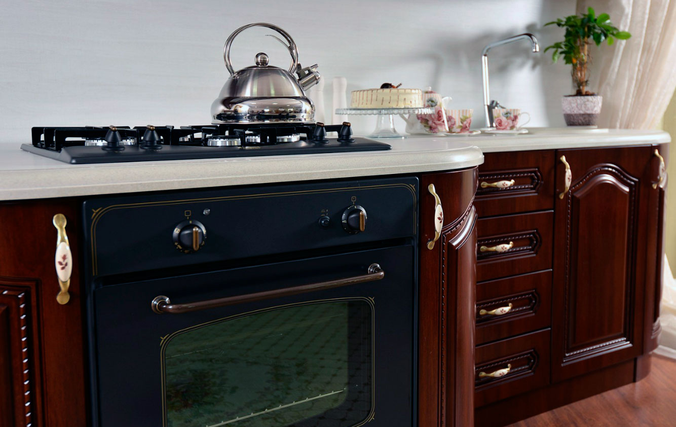Кухня Селена это просто шедевр. Встроенный стол под плиту выполнен в виде небольшого островка, выступает от столов кухни. Верхние шкафы украшают балюстрады. Закруглённые фасады придают гарнитуру особый шарм.