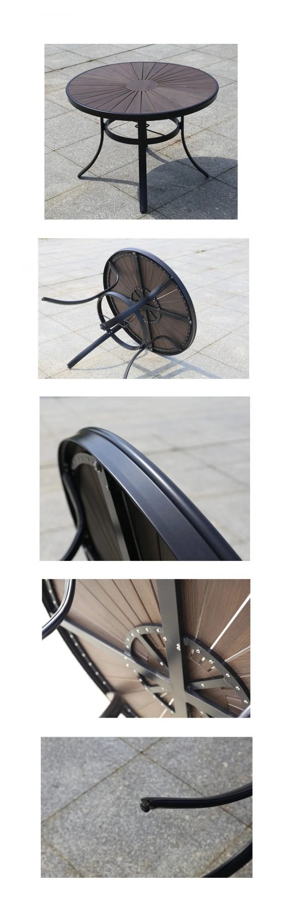 Конструкция стола представляет собой высококачественный алюминий, окрашенный порошковым способом. Столешницы серии Polywood изготовлены из неабсорбирующих воду композитных досок WPC, используемых, среди прочего, для производства современных систем настила и фасадов. Самым важным конструктивным элементом стола являются каркас из алюминиевого профиля. Его использование делает стол чрезвычайно устойчивым, когда он собран полностью! Такое решение позволило получить свободное пространство под столом и избежать ненужных дополнительных конструкций, мешающих удобному использованию мебели.