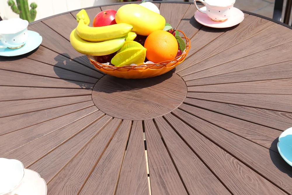 Комплект мебели из литого алюминия с ДПК стол D105 см Поливуд 2 + 4 кресла Поливуд 3 цвет каштан из литого алюминия с использованием древесно—полимерного композита Polywood разработана для удовлетворения потребностей даже самых требовательных клиентов. Это долговечная и в то же время очень красивая мебель. Материалы, из которых она изготовлена, чрезвычайно устойчивы к неблагоприятным погодным условиям.