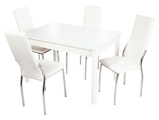 Обеденная группа Астима включает четыре мягких стула с высокой спинкой. Обивка из экокожи легко очищается от загрязнений при помощи влажной салфетки. Столешница выполнена из ударопрочного закаленного стекла, которое не боится перепадов температуры, а также обеспечивает легкое удаление пятен и других загрязнений. Стол легко раскладывается и образует два дополнительных места.