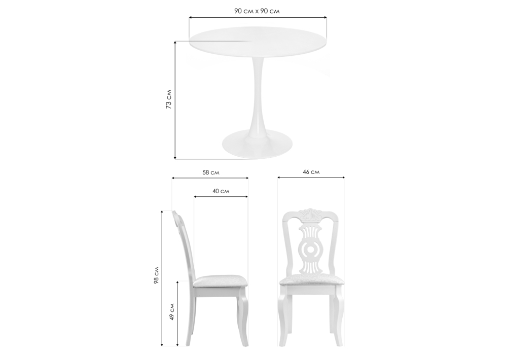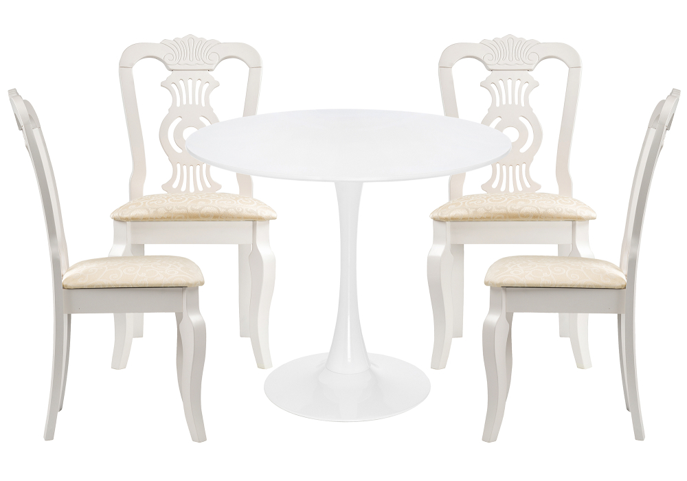 Обеденная группа Кодама white стильное решение для вашей кухни или гостиной. Интересный вариант для организации современного интерьера. Круглый стол в белом цвете выглядит очень легко. Спинка стульев имеет интересную резьбу, а ножки точёные с изящным изгибом. Стул сделан из массива гевеи. -