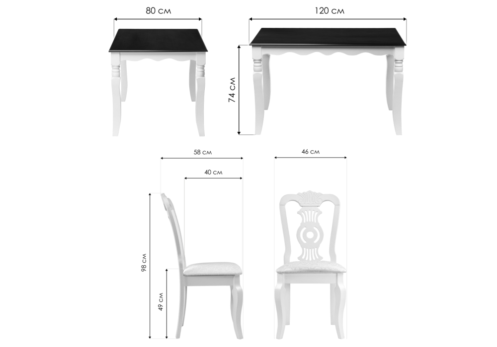 Обеденная группа Нивре butter white / white / oak стильное решение для вашей кухни или гостиной. Интересный вариант для организации современного интерьера. Прямоугольный стол со столешницей в тёмном цвете, с ножками в белом цвете. Стол Provance white / oak выполнен с изящными ножками. Спинка стульев имеет интересную резьбу, а ножки точёные с изящным изгибом. Стул сделан из массива гевеи. -