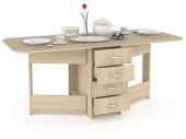 Стол-книжка с ящиками Глория 606 - удобный раскладной стол станет любимым местом веселых посиделок. В основании стола расположена тумбочка с четырьмя выдвижными ящиками одинаковой вместимости. Этот стол из серии столов-книжек, которые так хорошо зарекомендовали себя в использовании в квартирах с ограниченной площадью, на дачах или в загородных домах. В сложенном состоянии стол занимает совершенно мало места и может служить «рабочим» столиком на кухне, подставкой под цветы или телевизор. Разложив стол наполовину, Вы получаете обеденный стол для семьи, а разложив стол полностью - большой праздничный стол для хорошей кампании. Столешница стола имеет закругленные углы, что гарантирует травмобезопасность и будет оценено мамами маленьких детей. Данный стол будет служить Вам верой и правдой и будет Вашим верным спутником в будни и праздники. Стол изготовлен на современном высокоточном европейском оборудовании фирмы «BIESSE» (Италия) с использованием только высококачественных материалов. Ламинированная древесно-стружечная плита, из которой изготовлен стол, имеет гигиенический сертификат Е1 и относится к самой безопасной группе ДСП. Торцы деталей облицованы кромкой ПВХ 2 мм. по передней кромке и кромкой ПВХ 0,4 мм. по периметру, что улучшает эстетический вид стола и продлевает срок его службы.