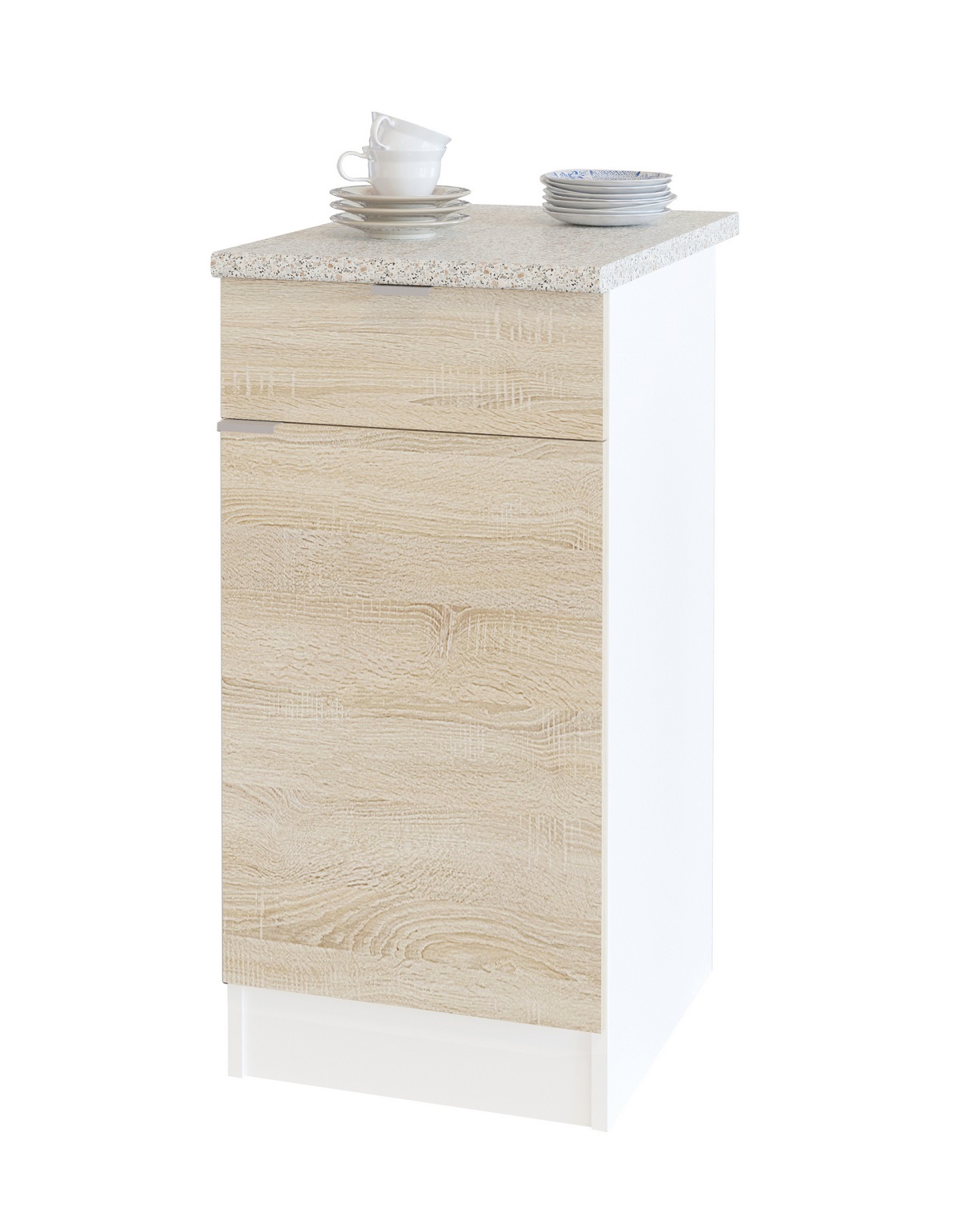 Кухонная рабочая тумба со столешницей, встроенным ящиком и полкой внутри. Дверь можно навесить на любую сторону. В ящике используются роликовые направляющие.