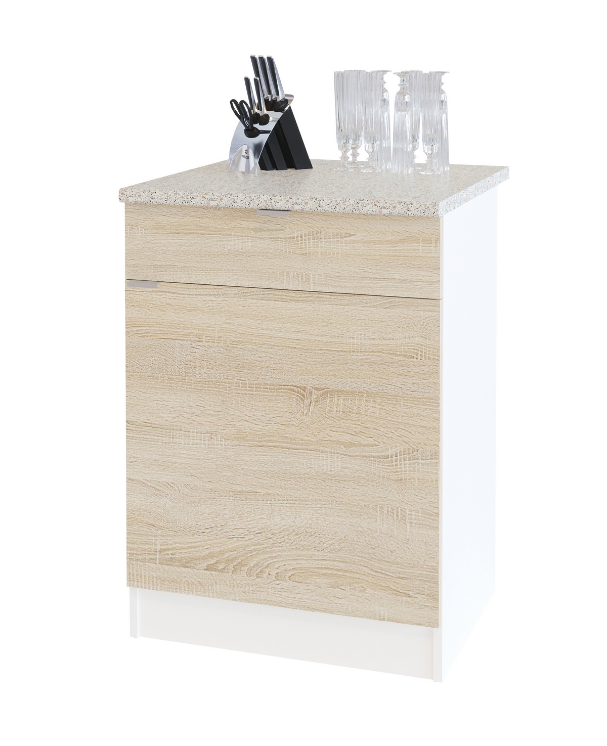 Рабочая кухонная тумба со столешницей, встроенным ящиком и полкой внутри. Дверцу можно навесить с любой стороны. Ручки на фасадах сделаны из металла.
