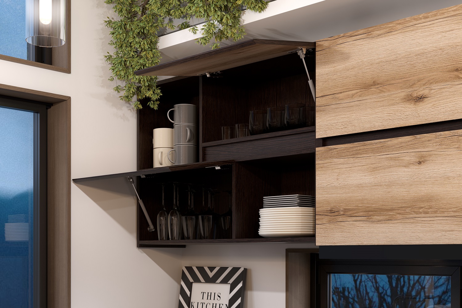 Каждый нижний модуль кухни укомплектован двумя декоративными передними и задними опорами, регулируемыми по высоте и сглаживающими неровности пола. Все створки оснащены четырех-шарнирными петлями.