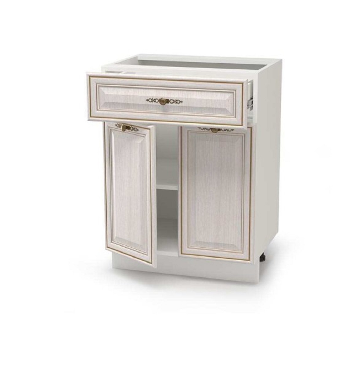 Конструкция с выдвижным ящиком, 2-я полками и 2-я глухими распашными дверцами.