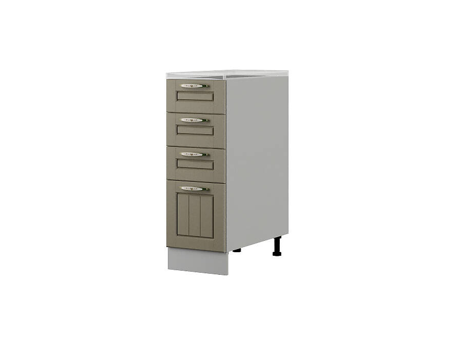 Шкаф нижний с четырьмя ящиками №63 Лондон ШНЯ 300 станет завершающим элементом кухонного гарнитура. Четыре выдвижных ящика пригодятся для хранения посуды, кухонных полотенец и салфеток, различной утвари, аксессуаров, столовых приборов, а также для сухих и не быстропортящихся продуктов. Кухня Лондон выполнена в неоклассическом стиле, а строгие линии фрезеровки погружают в атмосферу пресловутой английской чопорности.