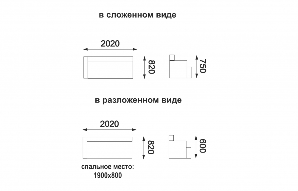 Ширина, мм 2020 Глубина, мм 820 Высота, мм 750, 600 ?Спальное местоШирина х Длина в мм800 х 1900 Производитель Вариантов исполнения 1 -