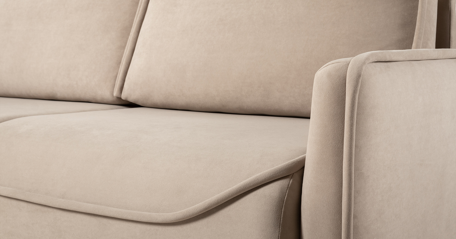 Кант на подушках заведен назад, с лицевой стороны по верху переходит на тыльную сторону. Выкатной блок целиковый, с лицевой стороны разделяется мягким выраженным кантом, переменного уровня примерно 240 мм от низа сидения. Подлокотники утонченные с кантом смещенным наружу. Кант по всему периметру подлокотника.