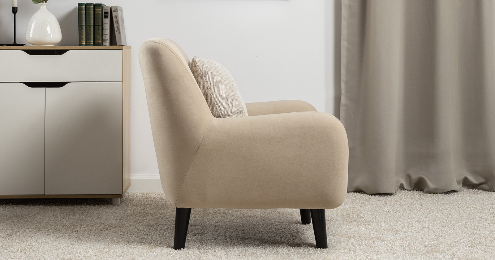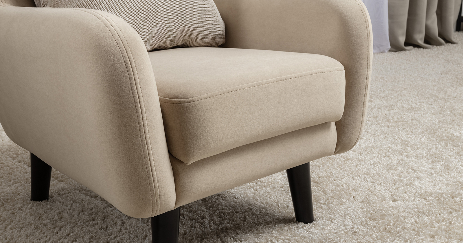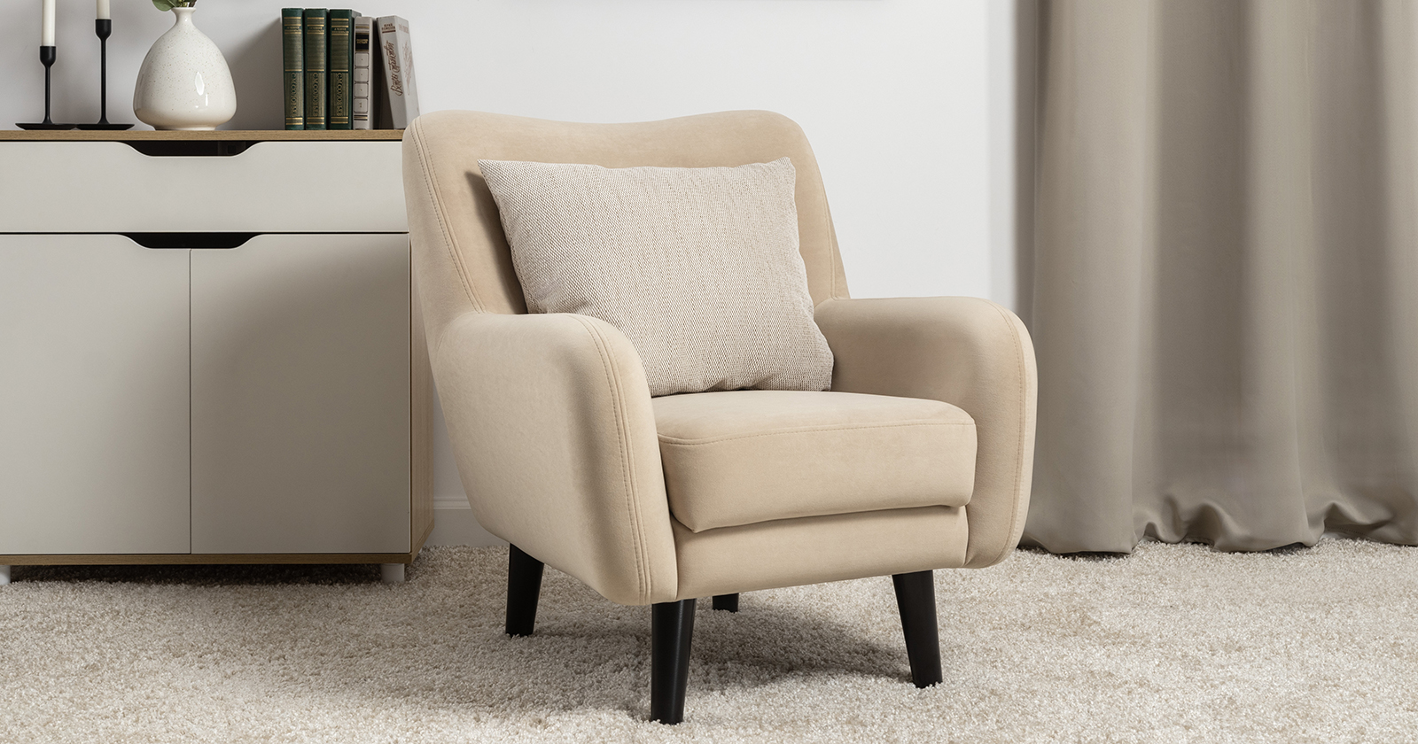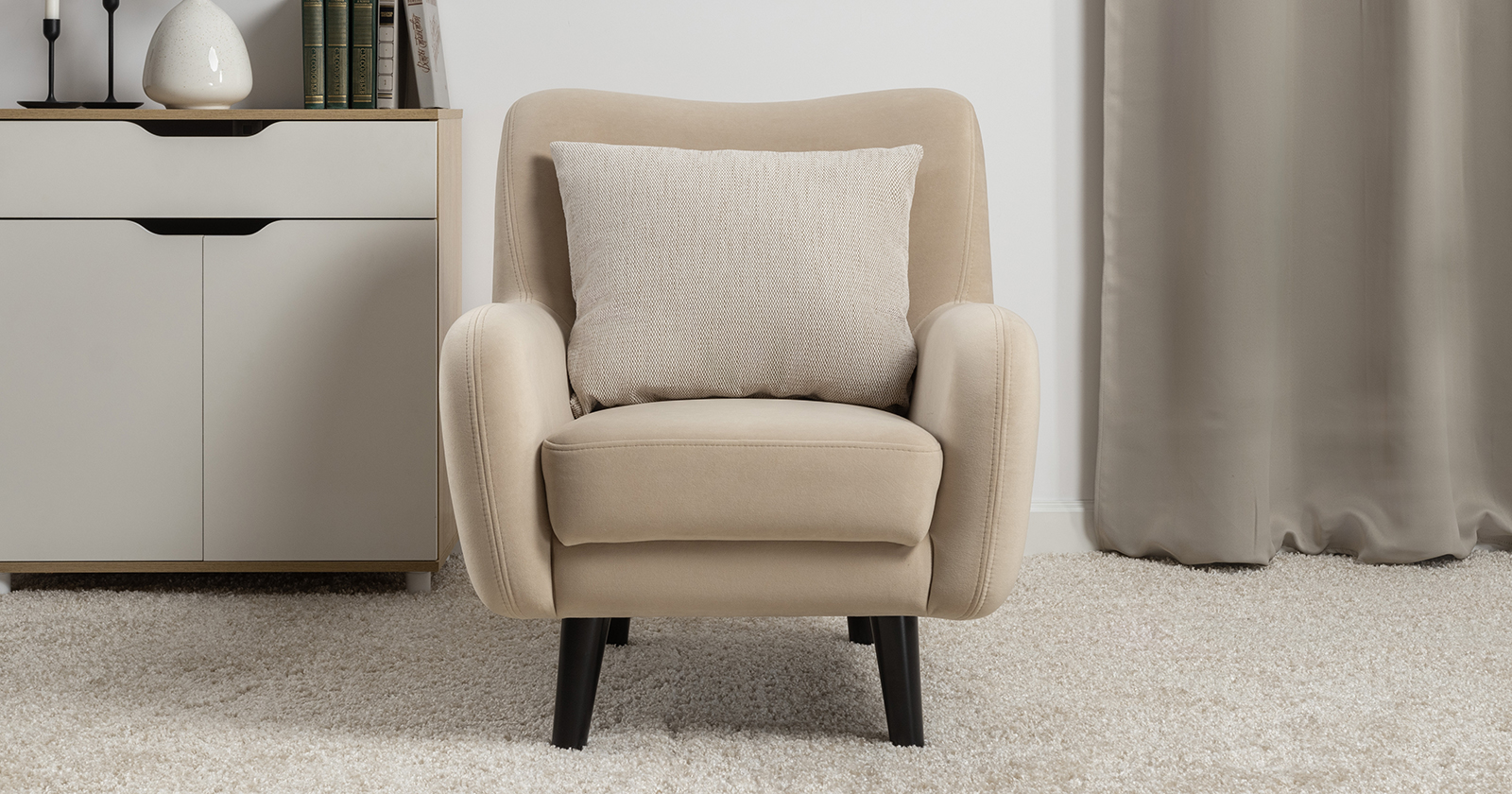 Стильное и уютное кресло Дакота с высокими опорами из массива станет акцентом интерьера вашей гостиной или спальни. Объемная приспинная подушка для комфортной посадки.  Vendetta (велюр): Состав: полиэстер (PES) 100% Количество циклов истирания: более 50 000 Основные преимущества: легкая чистка и уход дышащий износостойкость Габариты: Ш720 x Г830 x В830 мм высота посадки (мм): 430 глубина сиденья (мм): 400 высота спинки (мм): 450 высота подлокотника от сиденья (мм): 150 максимально допустимая нагрузка: 100 каркас:  фанера деревянный брус ДСП ДВП основание сиденья:  ППУ на блоке плоских пружин "змейка" съемные чехлы приспинных подушек: нет декоративные подушки, шт: 1 наполнитель подушек:  полиэфирное волокно «шарики» материал опор: лакированное дерево цвет опор: черная эмаль высота опор (мм): 180 Декор Декоративные отделочные строчки по боковинам и сиденью. В комплекте декоративная думка в ткани букле Назначение Гарантия: 18 месяцев