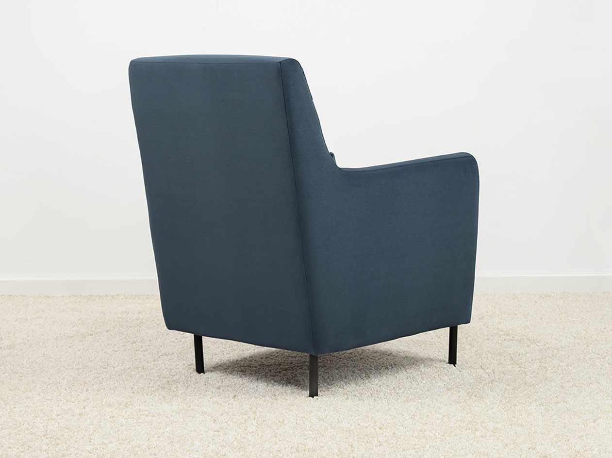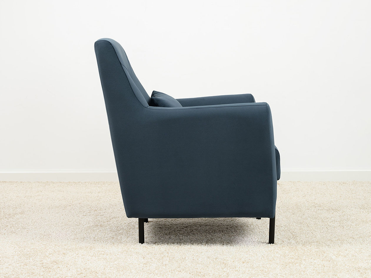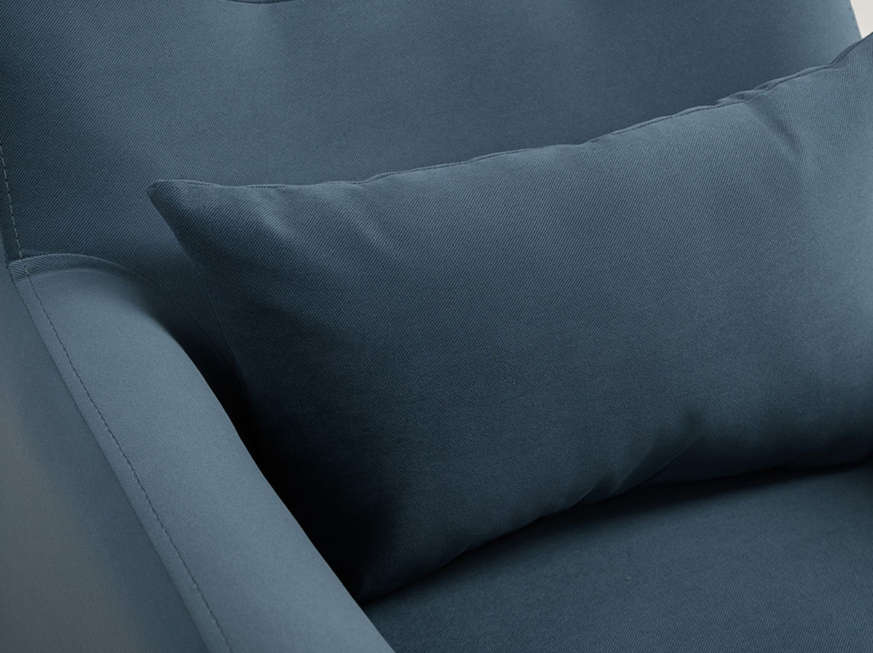 Декоративная утяжка на спинке кресла, декоративная подушка в цвете кресла, металлические опоры переходят в декоративный элемент подлокотника