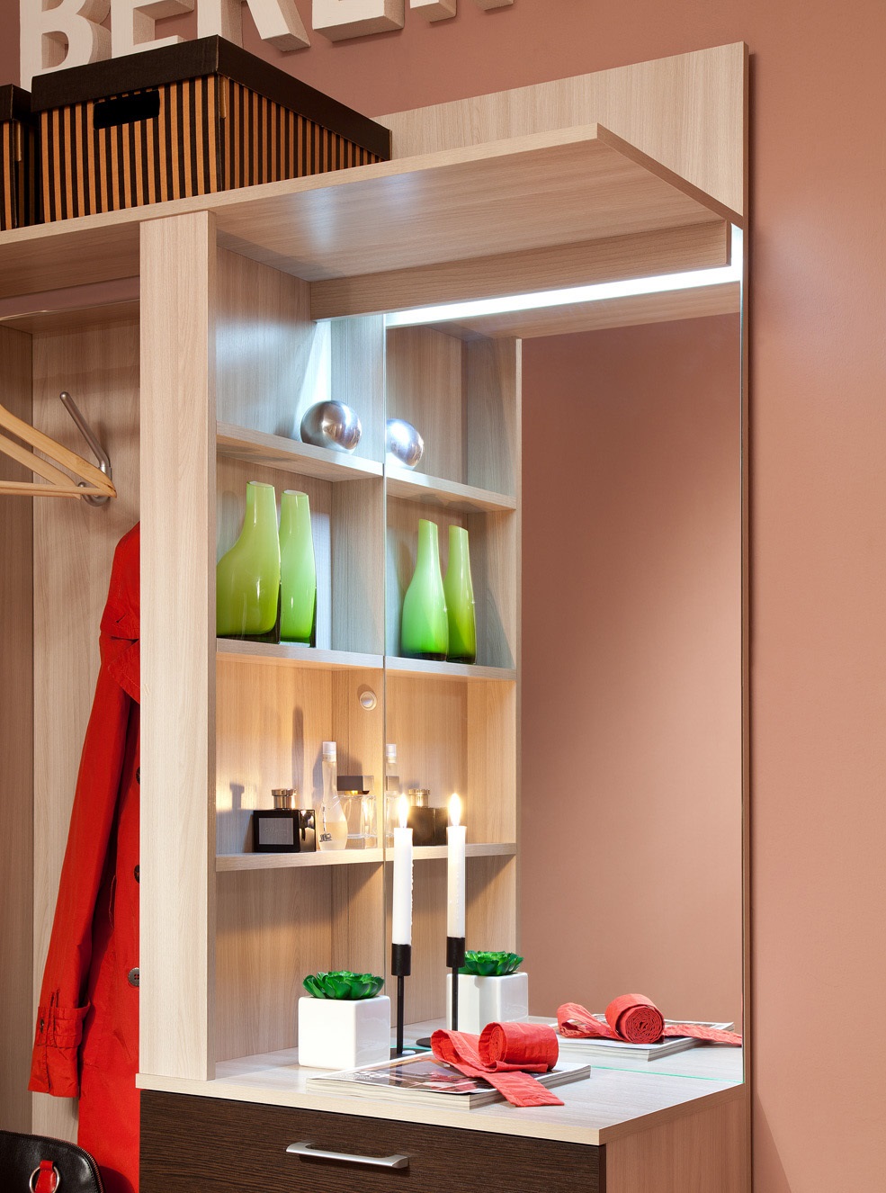 Прихожая Berlin исполнена в стиле модерн. Эффектное сочетание светлого декора и глянцевых фасадов зрительно расширяют прихожую, а также подчеркивает Ваше безупречный вкус. В данной комплектации предусмотрено всё: шкаф многоцелевого назначения с крючками для верхней одежды, зеркалом, полочками и ящиками, а также шкаф для обуви имеет девять специальных полок для обуви.