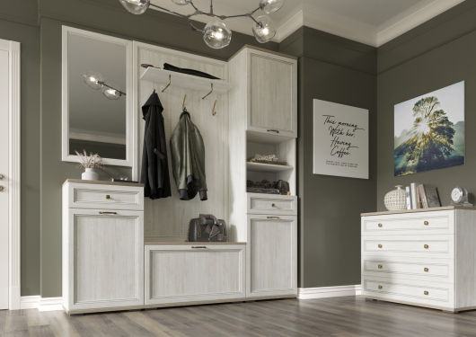 Прихожая Александрия поможет обустроить уютную прихожую, которая будет приветливо встречать вас прямо с порога. Вешалка имеет три крючка для верхней одежды и антресольную полку для головных уборов и шарфов. Небольшое зеркало перед выходом из дома позволит убедится в том, что выглядите вы неотразимо. Тумбы предназначены для размещения обуви всей семьи. Выдвижные ящики комода и полки, скрытые за распашными дверками шкафа, пригодятся для сложенной одежды и различных аксессуаров.