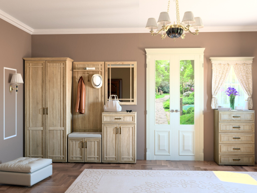 Прихожая Бруно (вариант 2) поможет обустроить комфортное и достаточно приветливое помещение. Зеркало перед выходом из дома убедит вас в том, что выглядите вы неотразимо. За распашными дверцами тумбы для обуви находится вместительное пространство с полками, созданное для аккуратного размещения обуви всей семьи. Широкий выдвижной ящик пригодятся для различной косметики для обуви и аксессуаров. Три крючка и штанги для вешалок-плечиков, скрытые в шкафах, предназначены для размещения верхней одежды, зонтов, шарфов и небольших сумок. Полки пригодится для хранения различных сезонных головных уборов и других аксессуаров.