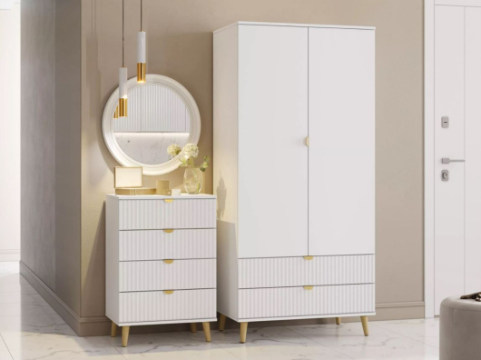Прихожая Дакота 2 с деревянными ножками и золотой фурнитурой выглядит стильно и элегантно, добавляя в интерьер нотки утончённости и уюта. Такой дизайн может хорошо вписаться в различные стили оформления, такие как скандинавский, классический или современный. -