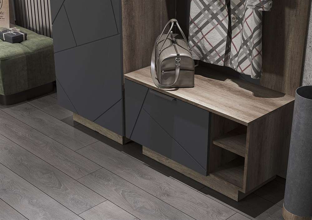 Прихожая Даллас 2 в серых тонах легко вписывается в различные стили интерьера, от современного до скандинавского или минималистического. Фасады выполнены из МДФ с интересным декором. Корпус выполнен в благородных, древесных тонах, что придаст интерьеру уюта.